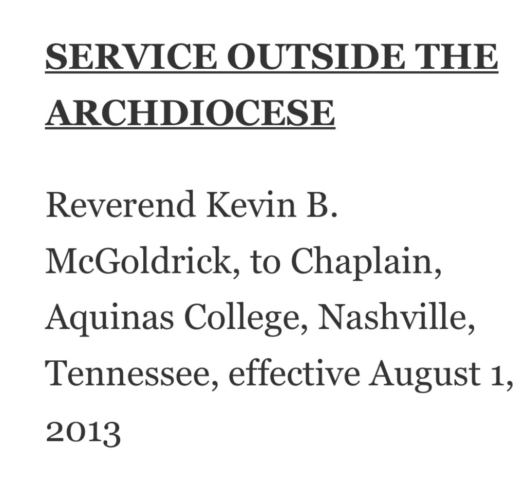 In July 2013, Catholic Philly, the official Archdiocesan news publication, reported that Father McGoldrick would become chaplain at Aquinas College in Nashville, Tennessee.