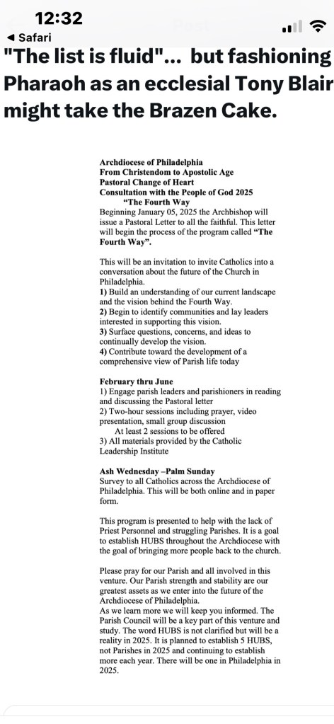 Archbishop Perez will invite the faithful to join a “conversation” called “The Fourth Way.” Huh? What were the first three ways? It doesn’t matter. Spoiler Alert: The “conversation” will eventually end with Perez reducing all 214 parishes of the Archdiocese of Philadelphia to 50-ish.